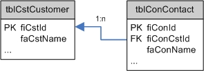 Kunden und Ansprechpartner sind in den Dateien tblCstCustomer und tblConContact gespeichert. Die Kunden werden über eine Kundennummer fiCstId eindeutig identifiziert. Damit eine Verknüpfung erstellt werden kann, wird die Kundennummer ebenfalls in der Datei der Ansprechpartner in dem Feld fiConCstId gespeichert. Für dieses Feld wird ein Schlüssel keyConCstId definiert (siehe Schlüssel bearbeiten ). Der Schlüssel ist mehrdeutig, da ein Kunde mehrere Ansprechpartner haben kann (1:n-Relation).