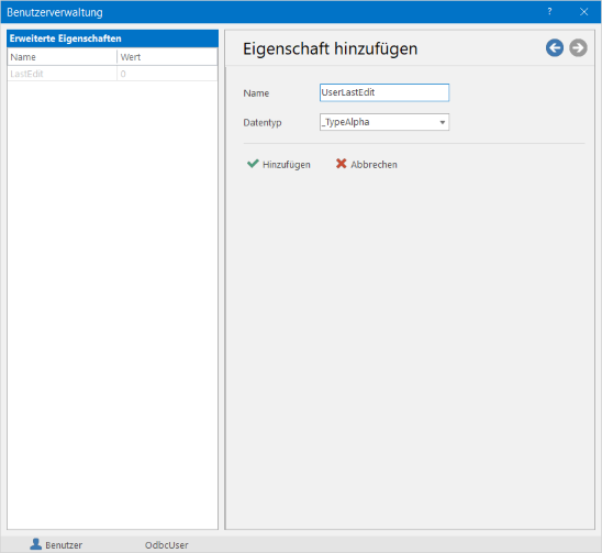 In diesem Bereich können dem ausgewählten Benutzer selbst definierte Eigenschaften zugeordnet werden. Mit der Schaltfläche [Eigenschaft hinzufügen] wird folgender Dialog aufgerufen: