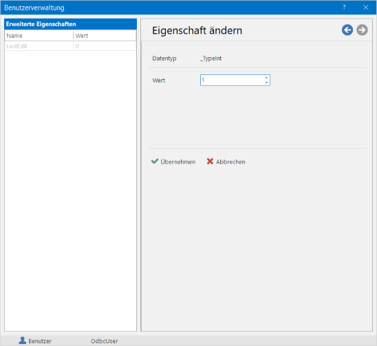 Der Eigenschaft muss ein eindeutiger Name gegeben werden. Der Typ der Eigenschaft wird über die ComboBox ausgewählt. Die Eigenschaft wird erst dann erzeugt, wenn die Schaltfläche [Hinzufügen] gedrückt wird. Zu diesem Zeitpunkt werden auch die Berechtigungen des Benutzers geprüft. Sind diese ausreichend, wird die Eigenschaft angelegt. In der Programmierung entspricht das der Anweisung UrmCreate (tHdlUser, _UrmTypeProperty , <Name>, <Type>). Der Wert der Eigenschaft kann entweder über die Schaltfläche [Eigenschaft ändern] oder zur Laufzeit mit der Anweisung UrmPropSet () gesetzt werden.