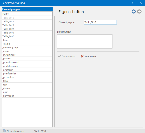 Über die Schaltfläche [Eigenschaften] werden die Eigenschaften der in der Liste ausgewählten Elementgruppe angezeigt. Die Eigenschaften, die hier geändert werden können, entsprechen den Eigenschaften beim Erstellen einer Elementgruppe.