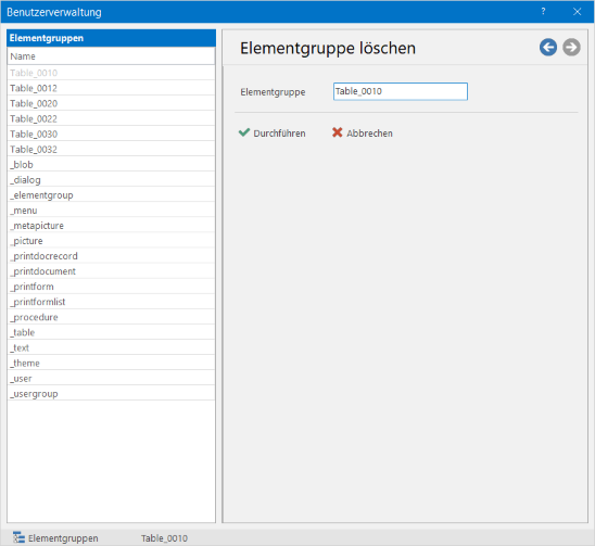 Die Elementgruppe wird erst gelöscht, wenn die Schaltfläche [Durchführen] geklickt wird. Die Überprüfung der Berechtigungen findet ebenfalls erst zu diesem Augenblick statt. Sind ausreichende Rechte vorhanden, wird die Gruppe gelöscht. Der Vorgang kann jederzeit durch Klicken von [Abbrechen] abgebrochen werden.