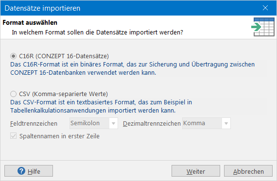 Beim CSV-Format können noch zusätzlich Zeichen für die Feld- und Dezimaltrennung definiert werden. Zusätzlich muss angegeben werden, ob in der ersten Zeile der Datei die Spaltennamen enthalten sind.