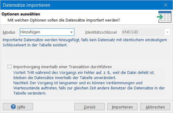 Bei den aktualisierenden Modi kann zusätzlich ein Identitätsschlüssel angegeben werden. Alle Felder, die nicht Bestandteil des Schlüssels sind, werden durch die importierten Daten ersetzt, wenn ein Datensatz mit den gleichen Schlüsselwerten bereits vorhanden ist.