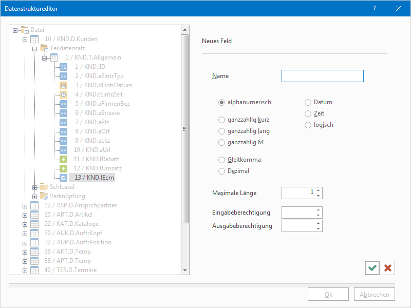 Die Parameter eines Feldes können nach der Auswahl des Feldes über die Schaltfläche verändert werden. Befinden sich Datensätze in der Datei, können nur Änderungen an der Ein- und Ausgabeberechtigung vorgenommen werden. Darüber hinaus kann nur die Eingabelänge von Felder vom Typ