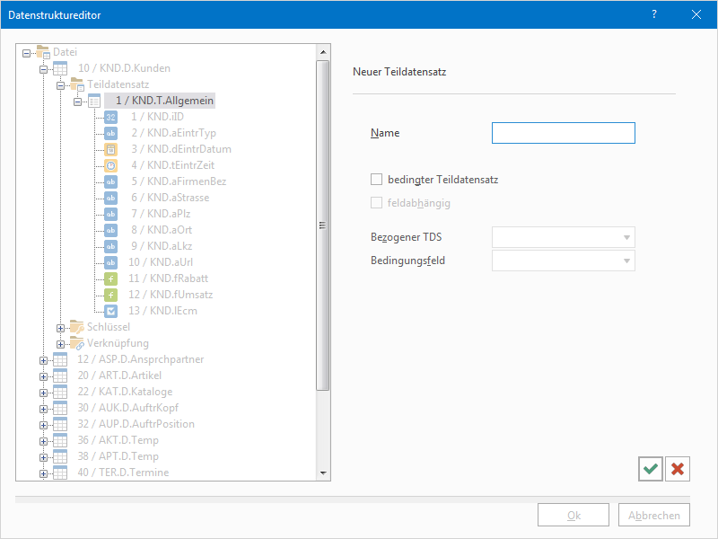 - Bedingter Teildatensatz Alle Teildatensätze, die nach dem ersten Teildatensatz angelegt werden, können bedingte Teildatensätze sein. Ein bedingter Teildatensatz wird nur dann zusammen mit dem Datensatz gespeichert, wenn er aktiv ist. Der Teildatensatz kann über einen Prozedurbefehl (TdsState()) oder den Inhalt eines Feldes aktiviert werden. Die Felder "Feldabhängig", "Bezogener Teildatensatz" und "Bedingungsfeld sind nur bei einem bedingten Teildatensatz aktiv.
