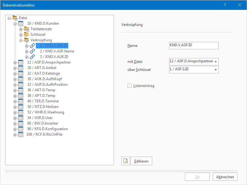 Verknüpfungen sind ein Bestandteil der Datenstruktur. Sie können über den Menüeintrag Extras / Datenstruktureditor… bearbeitet werden.