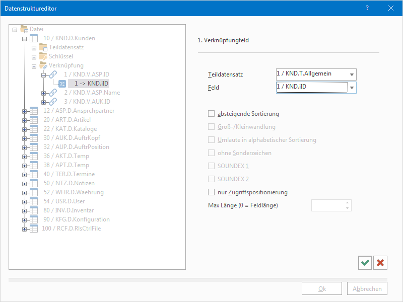 Da aus den Feldern der Verknüpfung der Schlüssel einer anderen Datei gebildet wird, können bei jedem Feld auch die Attribute eines Schlüsselfeldes gesetzt werden. Wird auf verknüpfte Daten zugegriffen, wird aufgrund der Verknüpfungsfelder ein Schlüssel in der verknüpften Datei gebildet. Ob ein Datensatz der anderen Datei verknüpft ist, entscheidet die Übereinstimmung des durch die Verknüpfung gebildeten Schlüssels und des im Datensatz tatsächlich vorhandenen Schlüssels. Dabei muss der Schlüssel des Datensatzes bis zur Länge des erzeugten Schlüssels übereinstimmen (ausgenommen die Felder mit "Nur Zugriffspositionierung"). Dazu stehen wie bei der Definition von Schlüsselfeldern entsprechende Attribute zur Verfügung.