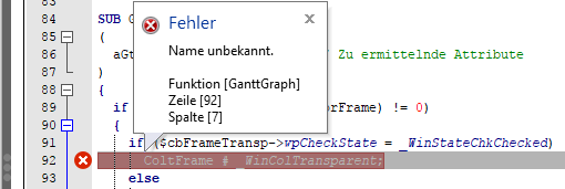 Fehler beim Übersetzen der Prozedur werden direkt im Editierfenster angezeigt: