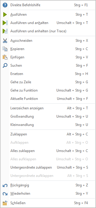 Die Funktionen entsprechen im wesentlichen den gleichnamigen Funktionen im Menü bzw. in der Werkzeugleiste. Im linken Rand des Editierbereiches wird ein anderes Kontextmenü aufgerufen, in dem die Funktionen für Breakpoints aufgerufen werden können.
