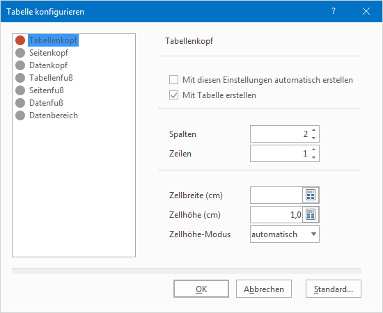 - Mit Tabelle erstellen Das auf der linken Seite ausgewählte Objekt wird mit der Tabelle erzeugt. Soll zum Beispiel eine Tabelle ohne Seitenkopf erstellt werden, kann das Element über diese Checkbox deaktiviert werden.
