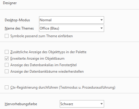 - Ctx-Registrierung durchführen (Testmodus u. Prozedurausführung) Ist diese Einstellung gesetzt, wird beim Starten des Designers, falls notwendig, die Ctx-Registrierung für alle Objekte (siehe beispielsweise
