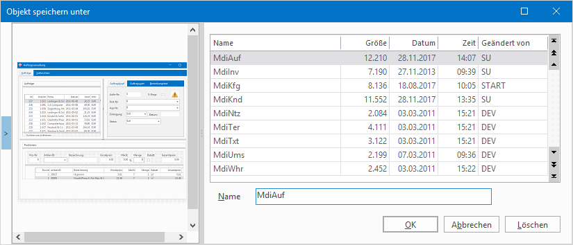 In der angezeigten Liste kann ein bereits vergebener Name ausgewählt oder ein neuer Name im Feld "Name" eingegeben werden. Wird ein Name aus der Liste ausgewählt, wird das gespeicherte Fenster durch das neue Fenster überschrieben. Durch Klicken auf die Schaltfläche [OK] wird das Fenster gespeichert.