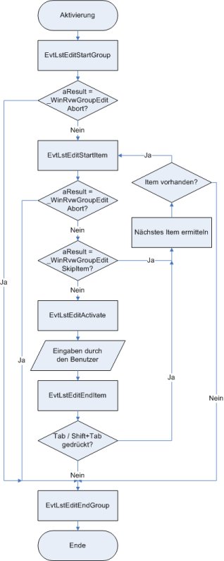 Das Ereignis EvtLstEditEndItem wird auch aufgerufen, wenn die Bearbeitung in dem Ereignis EvtLstEditStartItem abgebrochen wurde. Wird die Bearbeitung bereits im Ereignis EvtLstEditStartGroup abgebrochen, so wird das Ereignis EvtLstEditEndGroup ausgelöst.