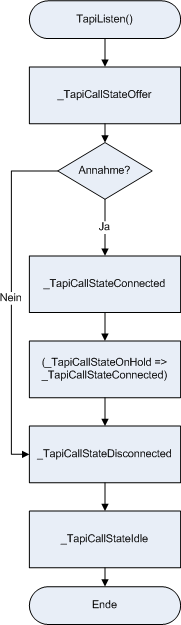 Die angegebene Prozedur wird ausgeführt, wenn die TAPI-Schnittstelle ein Ereignis für einen eingehenden oder ausgehenden Anruf signalisiert. Für das Gerät muss zuvor mit dem Befehl TapiListen () die Überwachung aktiviert worden sein.