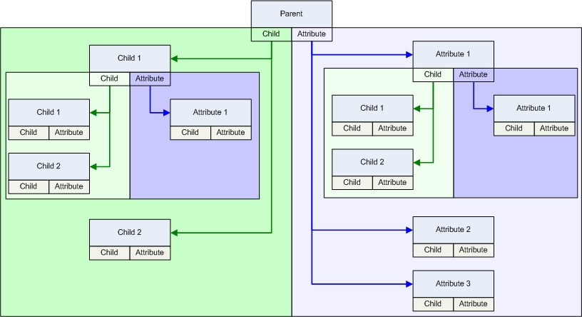 Jedes CteNode-Objekt kann weitere CteNode-Objekte als untergeordnete Knoten (Child) und als Attributknoten (Attrib) enthalten. Die untergeordneten Objekte werden in eigenen Listen verwaltet. Alle Kinder eines Baumknotens befinden sich in der Child-Liste, alle Attribute in der Attribute-Liste. Da alle untergeordnete Objekte wiederum CteNode-Objekte sind, haben diese ebenfalls eine Child- und eine Attribute-Liste.