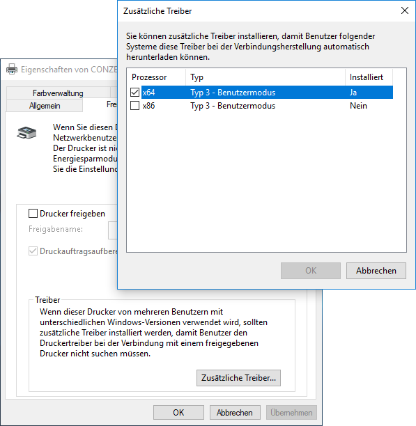 Die CONZEPT 16-Installationsroutine installiert die Druckertreiber jeweils passend zur lokalen Systemarchitektur. Das bedeutet, dass auf einem 32-Bit-System die 32-Bit-Druckertreiber und auf einem 64-Bit-System die 64-Bit-Druckertreiber von CONZEPT 16 eingerichtet werden. Sollen die Druckertreiber von einem 32-Bit-Druckserver an 32-Bit-Clients freigegeben werden, ist dies ohne weiteres möglich. Die Drucker werden über das Eigenschaftsmenü unter "Freigabe" freigegeben und auf den Clients entsprechend über die Druckerliste als neuer Netzwerkdrucker hinzugefügt. Gleiches gilt in einer homogenen Netzwerkumgebung mit 64-Bit-Systemen.