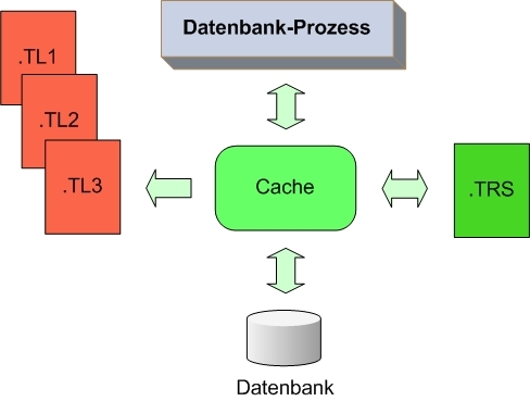 Der Datenbank-Prozess nutzt eine Reihe von Ressourcen, um den Datenbankbetrieb und damit auch das Transaktionsmanagement korrekt durchführen zu können. Zunächst fordert jeder Datenbank-Prozess die konfigurierte Menge an Datenbankcache an. Der Cache wird verwendet, um Datenbanksegmente zwischenzuspeichern und die Zugriffszeiten darauf zu verkürzen. Zudem verarbeitet der Cache die Datenbanktransaktionen. Dabei werden laufende und abgeschlossene Transaktionen im Cache vorgehalten. Sollte der Cache für die Transaktionen nicht ausreichen, lagert der Datenbank-Prozess Informationen in einer temporären Transaktionsdatei mit dem Namen <Datenbankname>.trs aus.