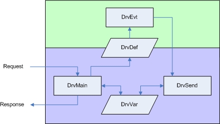 Die Funktionen in DrvEvt schreiben mit Hilfe der Funktionen in DrvSend eine Antwort-Nachricht (Response) auf den Socket. Das Abschließen und Versenden der Nachricht erfolgt dann wieder in der DrvMain nach der Rückkehr aus den Funktionsaufrufen in die Prozedur DrvEvt.