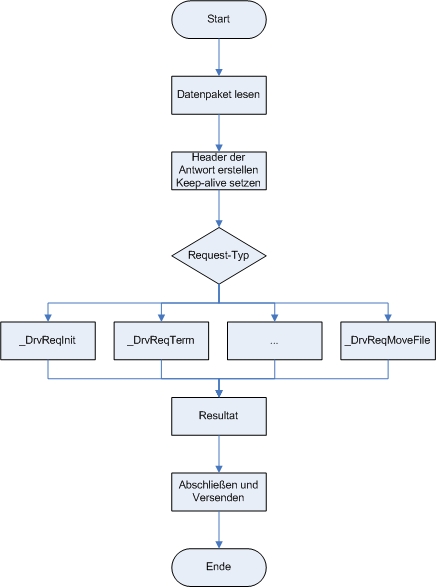 Wird eine Nachricht von Typ _DrvReqInit empfangen, wird in der DrvMain das gesamte Datenpaket gelesen. In dem Datenpaket befinden sich Informationen über den Laufwerkstreiber, den Computer auf dem der Laufwerkstreiber installiert ist und die Version des installierten Treibers. Die Informationen werden in die entsprechenden globalen Variablen gelesen und der Kopf des Antwort-Pakets geschrieben. Der Keep-alive der Verbindung wird auf 60 Sekunden gesetzt. Anschließend wird die Funktion DrvEvt:EvtInit aufgerufen.