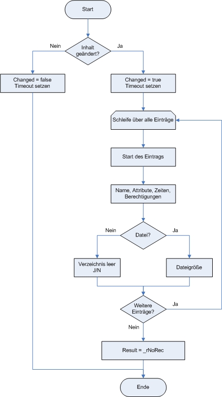 Die Antwort gliedert sich in zwei Teile. Zunächst wird überprüft, ob sich Änderungen ergeben haben. Sollte das nicht der Fall sein, wird nur ein kurzes Datenpaket mit den Bereichen _DrvItemContentChanged und _DrvItemTimeout übertragen. Der Laufwerkstreiber erstellt das Verzeichnis aus dem Inhalt seines Caches.