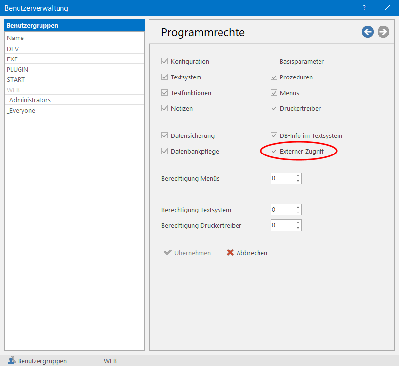 0und für den externen Zugriff besitzt. Das Zugriffsrecht wird an dieser Stelle nicht ausgewertet. - Speichern - Ist dieses Recht gesetzt, können mit dem INSERT-Statement neue Datensätze eingefügt werden.