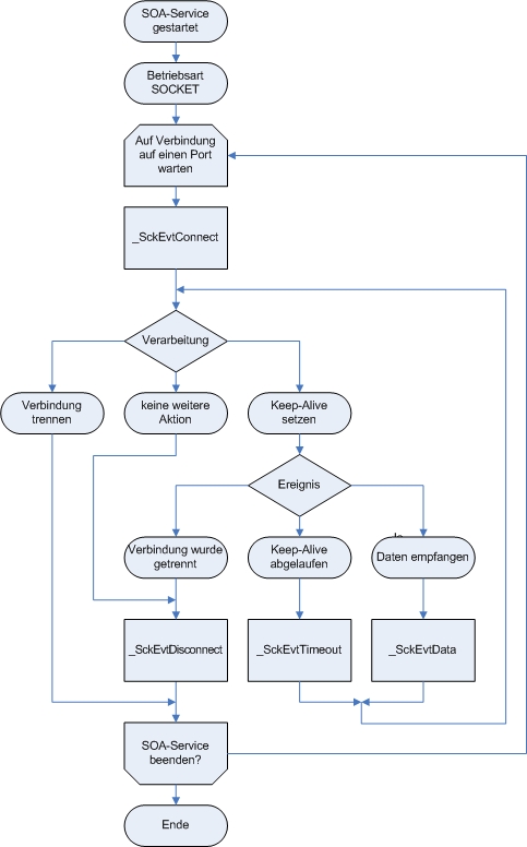 _SckEvtConnectBei einer neuen Verbindung wird dieses Ereignis ausgelöst. Falls die gesamte Verarbeitung in der Ereignisfunktion durchgeführt werden kann, sollte der Socket am Ende mitJobClose ()geschlossen werden (EigenschaftSvcSckHandledes übergebenen Objekts). Damit ist die Verbindung beendet und es gibt auch keine weiteren Ereignisse mehr für diese Verbindung. Um den Socket für einen weiteren Datenaustausch zu verwenden, muss mit Keep-Alives gearbeitet werden (siehe Verarbeitungshinweise )._SckEvtDisconnectFalls der Socket der Verbindung nicht aktiv mitSckClose ()geschlossen wurde, wird nach dem Trennen der Verbindung in jedem Fall dieses Ereignis aufgerufen. Der Socket ist beim Aufruf der Ereignisprozedur bereits geschlossen._SckEvtDataBleibt der Socket nach dem Ende der Ereignisprozedur noch geöffnet, kann dieses Ereignis auftreten, wenn innerhalb der Keep-Alive-Zeit neue Daten empfangen werden._SckEvtTimeoutBleibt der Socket nach dem Ende der Ereignisprozedur noch geöffnet, kann dieses Ereignis auftreten, wenn innerhalb der Keep-Alive-Zeit keine neue Daten mehr empfangen wurden.