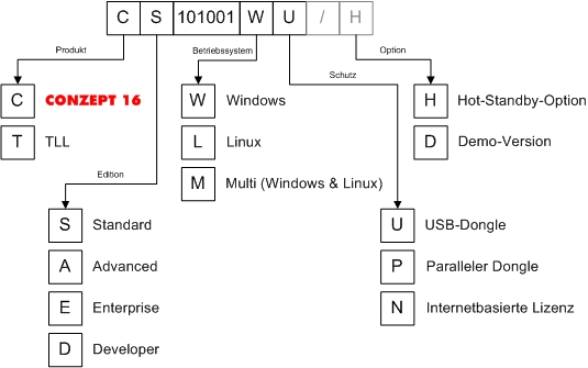 Es werden zwei Lizenztypen ausgeliefert. "C" bezeichnet eine unbefristete CONZEPT 16-Lizenz. Diese Lizenz wird nur mit einem Dongle (USB oder Parallelport) ausgeliefert. Mit "T" ist eine TLL-Lizenz (Time-limited License) gekennzeichnet. Die Lizenz besitzt keinen Dongle, der Lizenzschutz erfolgt über einen Lizenzserver.